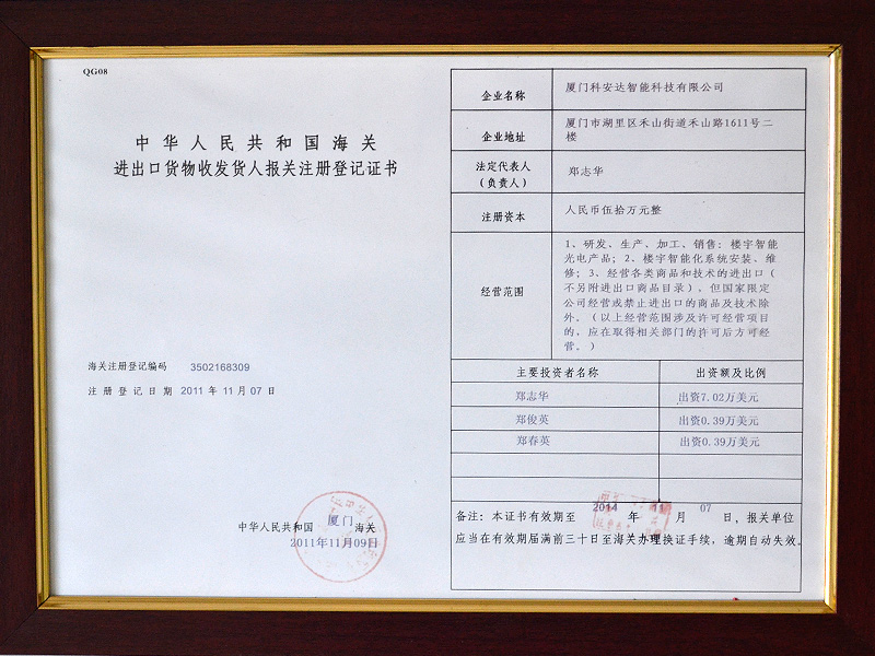 廈門科安達(dá)智能科技有限公司,是一家擁有完全自主開發(fā)能力和生產(chǎn)能力的知名高新技術(shù)企業(yè)?!癒AD”是科安達(dá)公司在國(guó)內(nèi)注冊(cè)的全球性品牌,公司已經(jīng)通過(guò)ISO9001:2008國(guó)際質(zhì)量體系認(rèn)證和3C等強(qiáng)制性認(rèn)證,并成為國(guó)內(nèi)外很多知名安防產(chǎn)品的核心合作伙伴 詳情>>